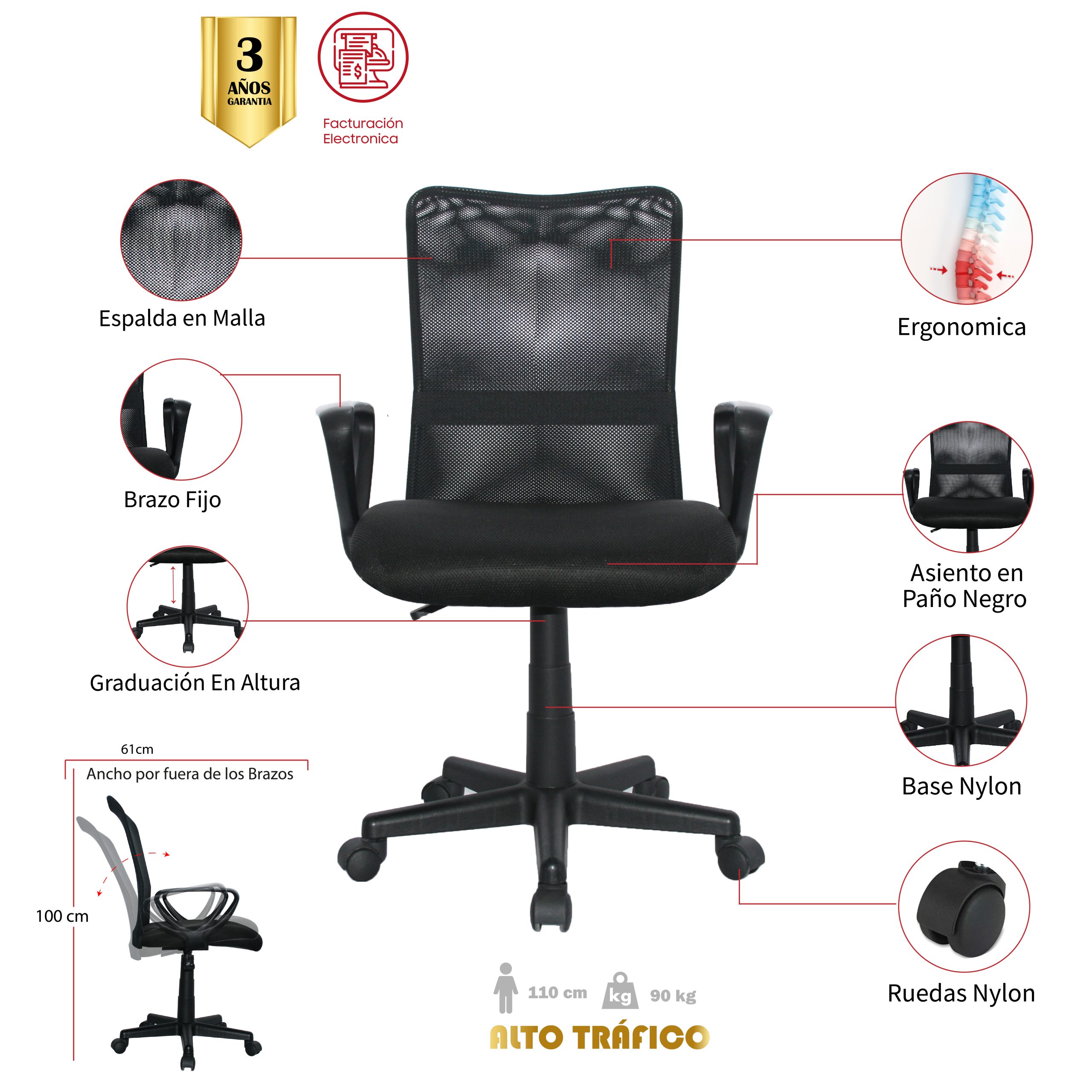 - Respaldo en malla antitranspirante color Negro