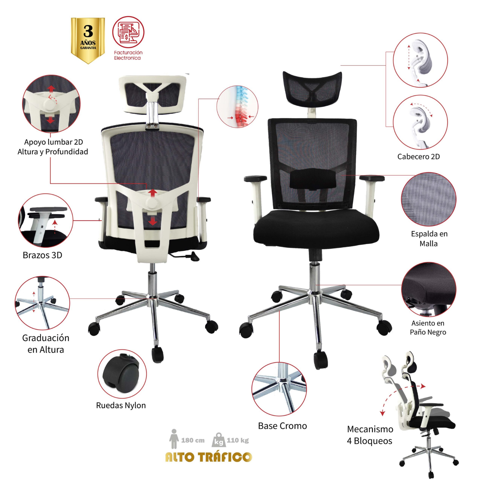 - Respaldo en malla antitranspirante color Negro